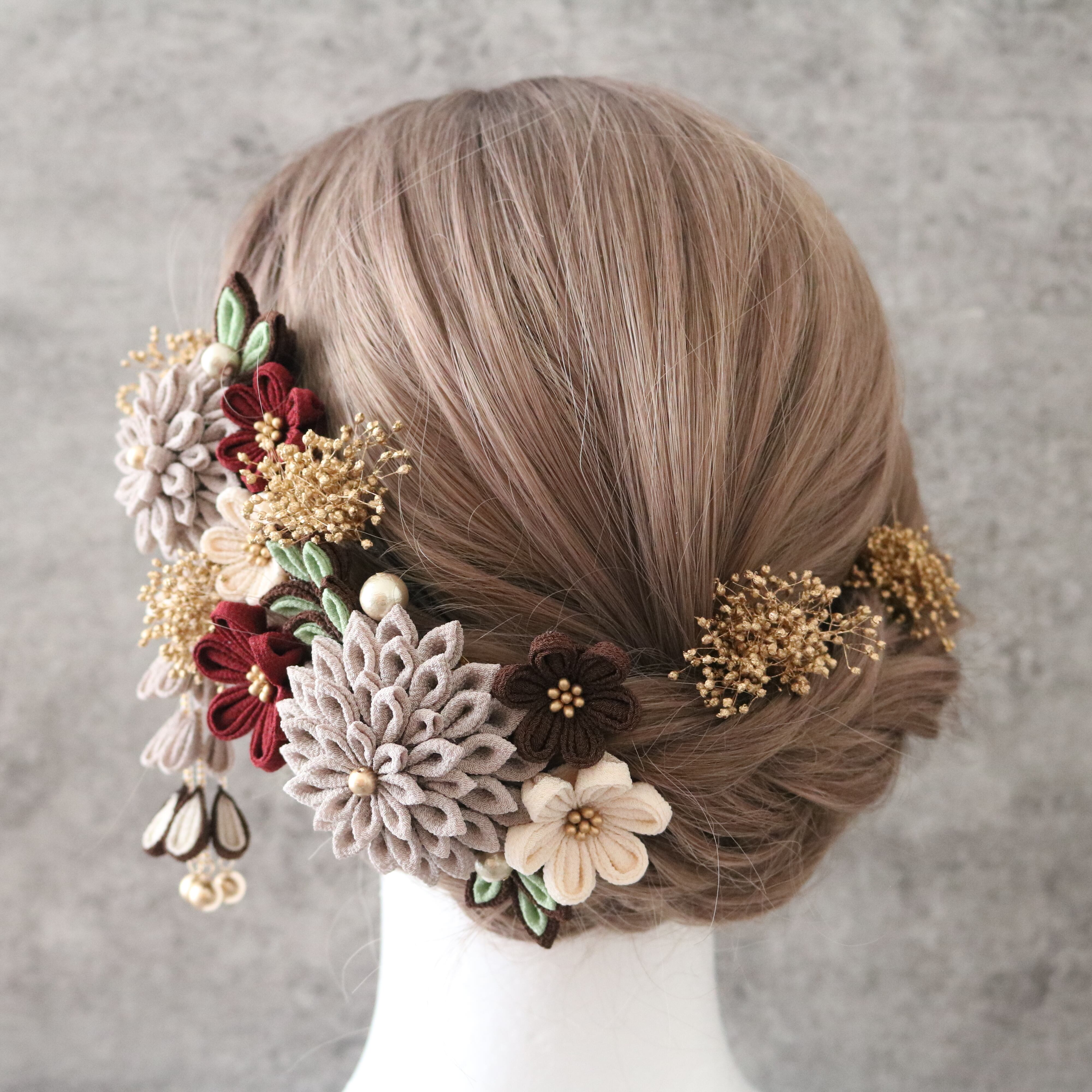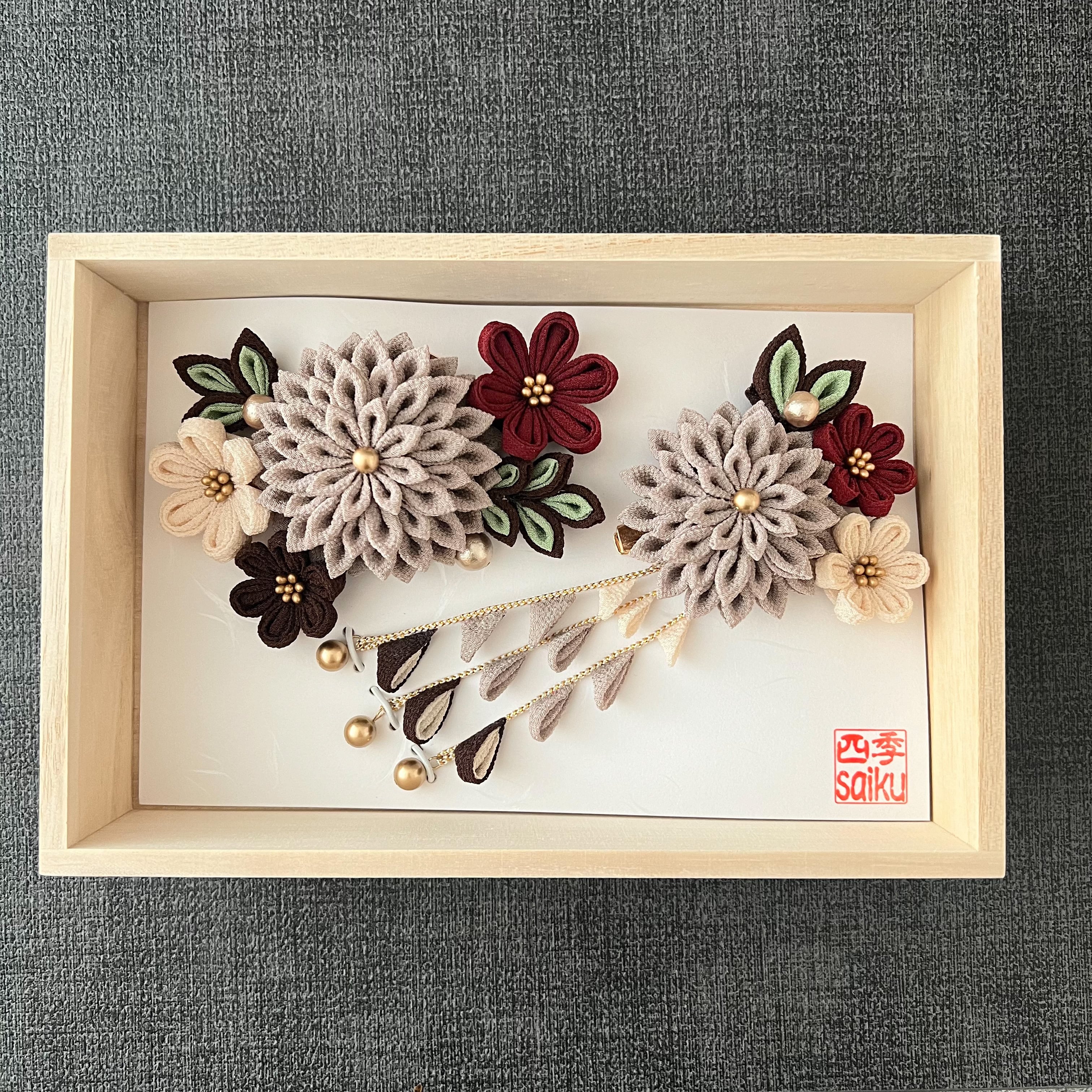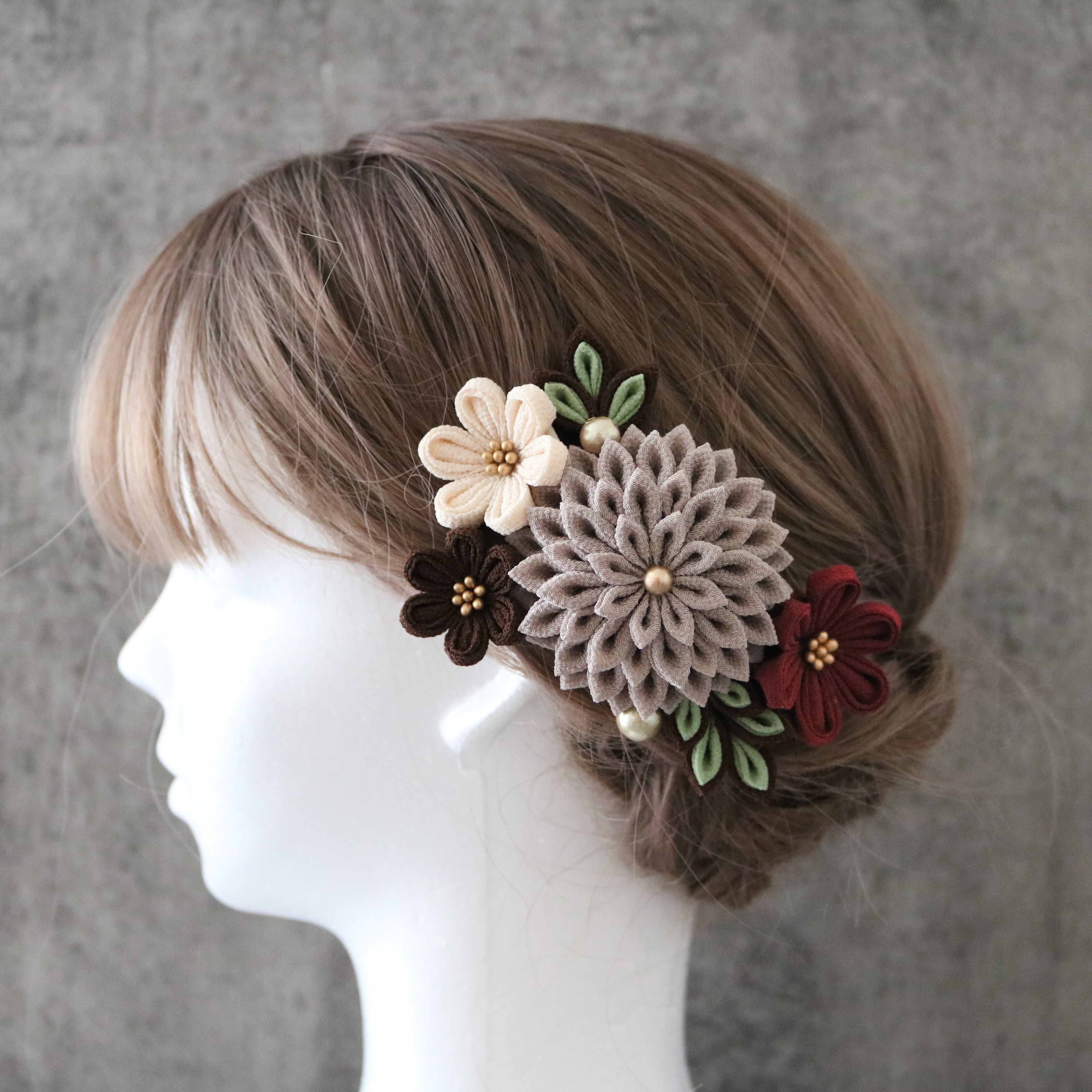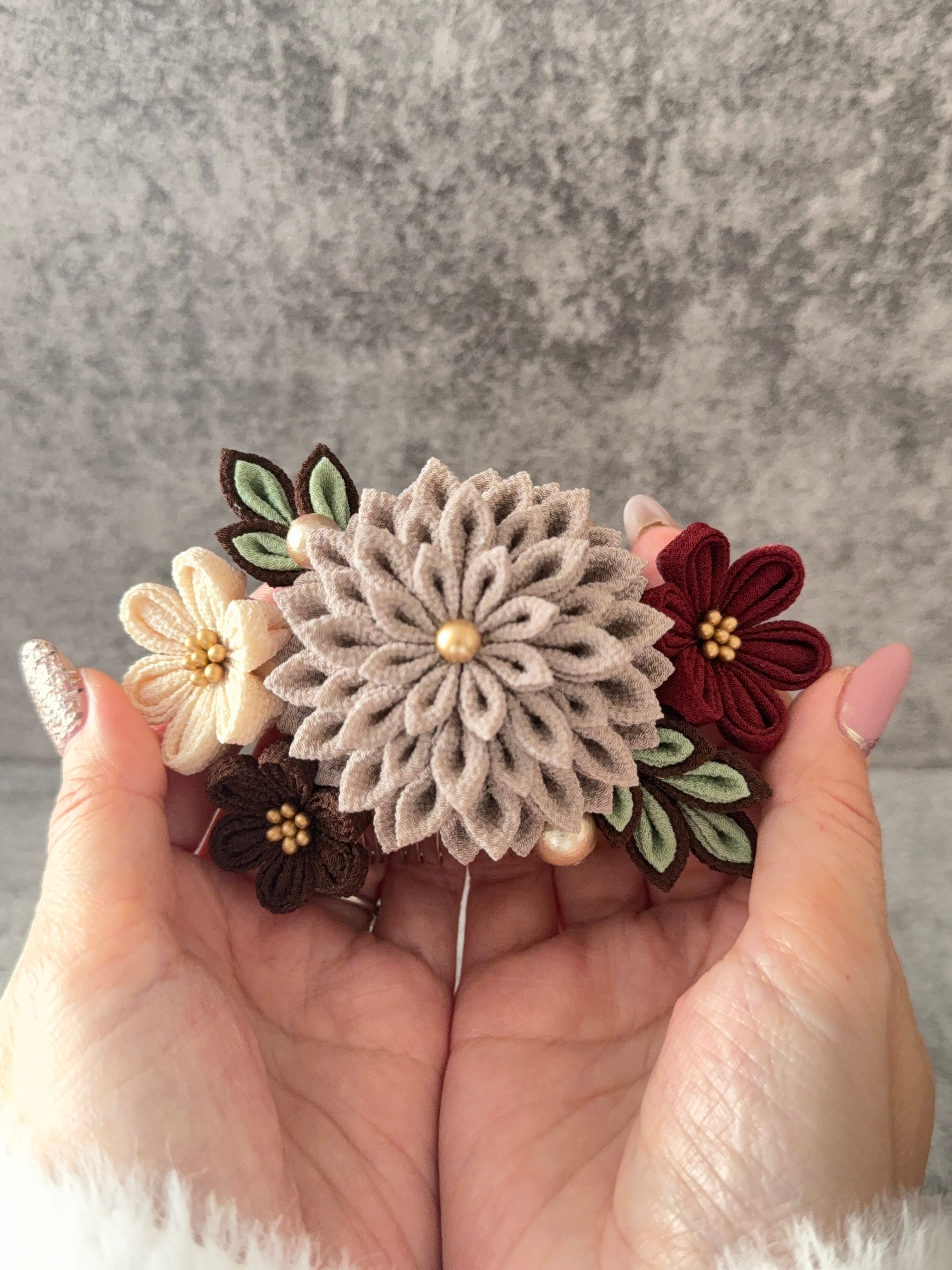 グレージュ*大サイズ&下がり付き*レトロな髪飾り*つまみ細工