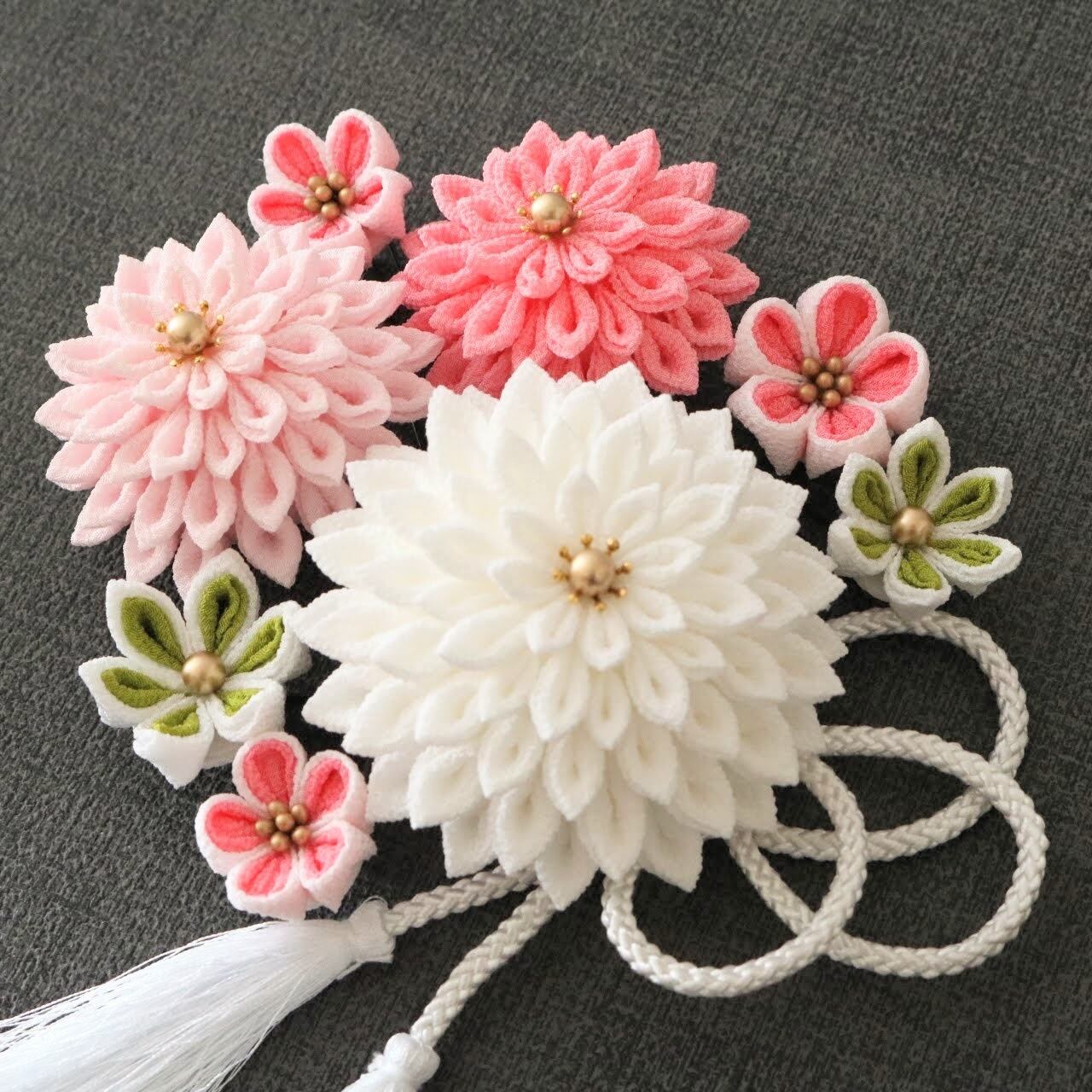 つまみ細工で製作したダリアと小花をセットにした